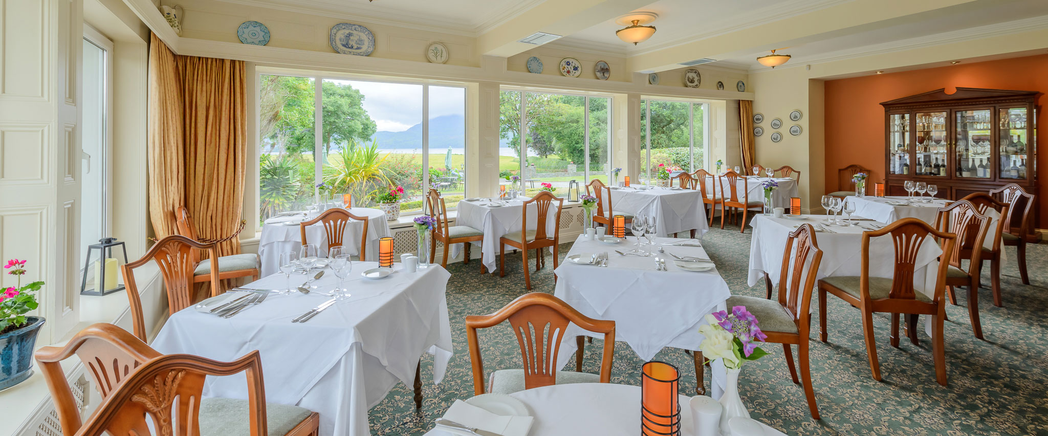 Loch Lein has a beautiful panoramic dining room – which provides a stylish, elegant and informal setting for Breakfast and Dinner, to meet, celebrate or simply to pass the time. Once you’ve freshened up for dinner after a great day out on the Reeks & Lakes, come and join us for a drink in our small but cosy bar. The Bar is very much in keeping with the Hotel feel and boasts some of the best views you’ll find in any Killarney Hotel and when the weather is being kind, there’s always the garden where you can make the most of al fresco whilst sipping a glass of chilled White or Prosecco, – so whatever your tipple you are sure to find something that takes your fancy.